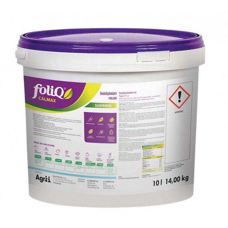 Continutul de magneziu si azot impreuna cu o varietate de microelemente garanteaza nutritia suplimentara necesara cresterii corespunzatoare a plantelor, a productiei si calitatii. Foliq Calmax prin compozitia sa (14%N+21%CaO+3%MgO+microelemente) furnizeaza suplimentul necesar de micro si macroelemente asigurand o productie ridicata atat din punct de vedere calitativ cat si cantitativ.